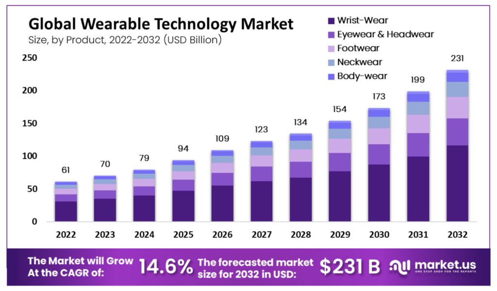 As for 2022, Market.us reported that the global wearables market value had reached $61.3 billion that year, with a forecasted valuation of $231 billion by 2032, signaling a compounded annual growth rate of over 14.6%.